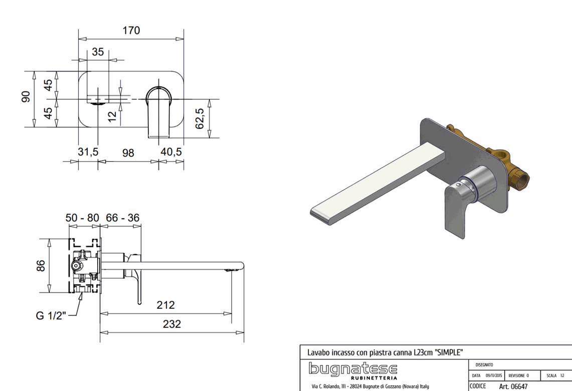 BUGNATESE SIMPLE Bateria umywalkowa podtynkowa, wylewka 21 cm, chrom 6647CR