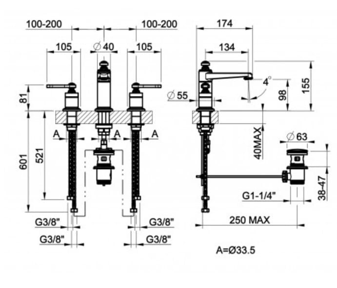 GESSI VENTI20 Trzyotworowa bateria umywalkowa 15,5 cm z korkiem automatycznym, chrom 65012.031