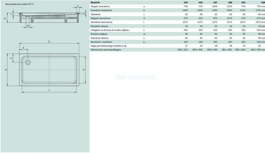 KALDEWEI DUSCHPLAN 423-1 Brodzik prostokątny 140x70x65 cm, 432300010001